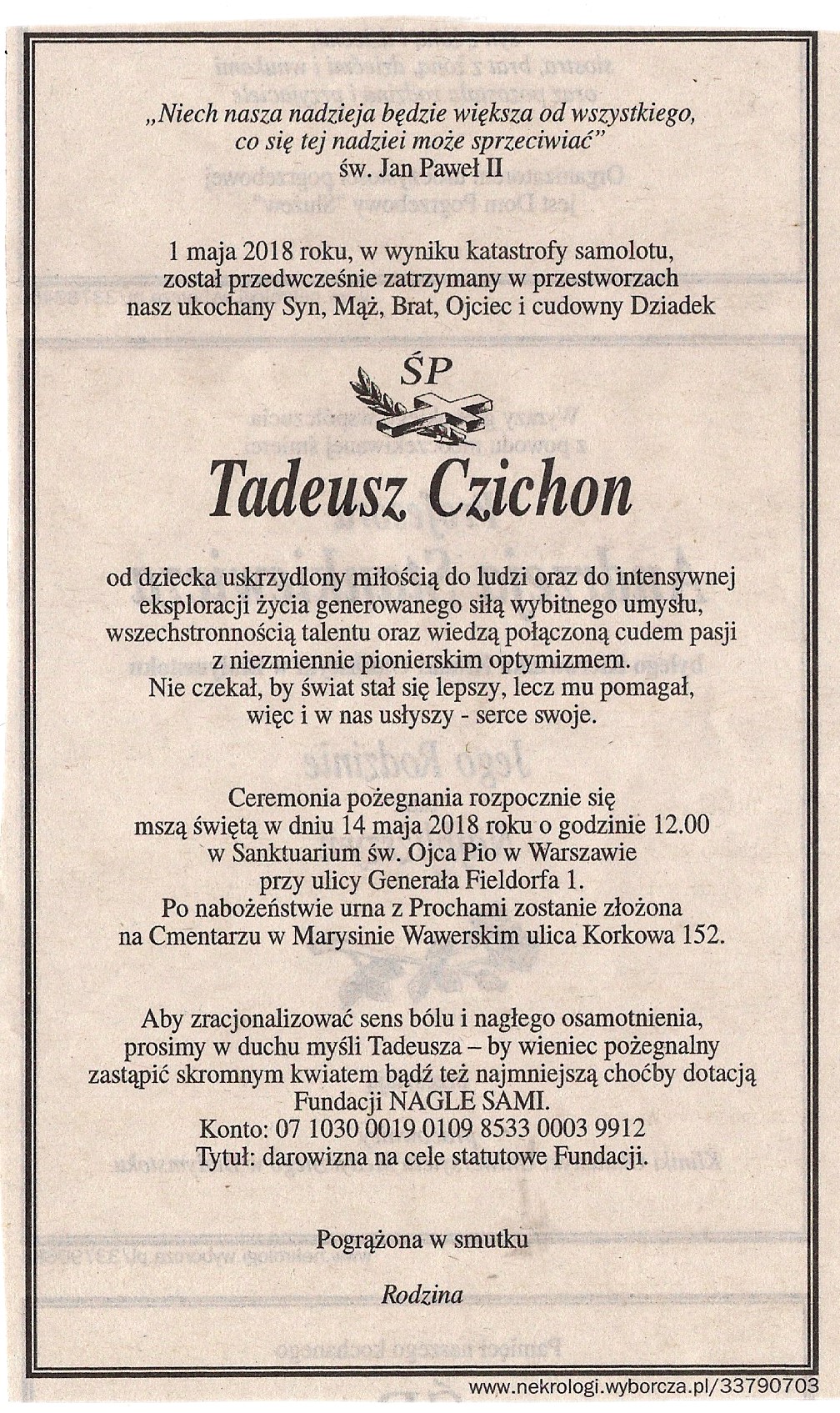 Nabożeństwo żałobne odbędzie się w poniedziałek 14.05.2018 r. o godz. 12:00 w Sanktuarium Św. Ojca Pio w Warszawie, przy ul. Generała Fieldorfa 1. Po nabożeństwie urna z prochami zostanie złożona na cmentarzu w Marysinie Wawerskim, ul. Korkowa 152.