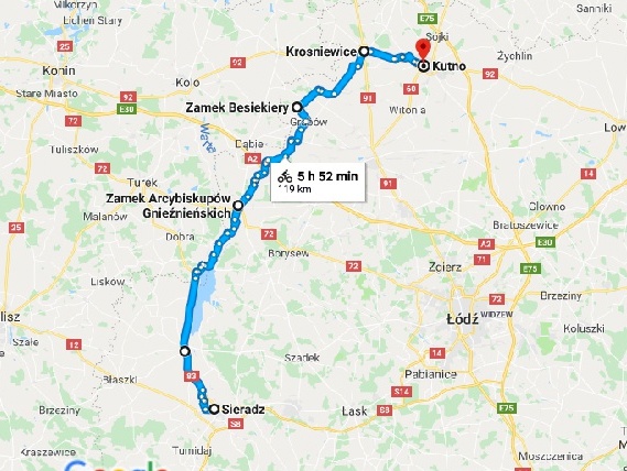 Trasa rowerowa: Uniejów - Chwalborzyce - Grabów - Biesiekiery - Krośniewice - Kutno (67 km)