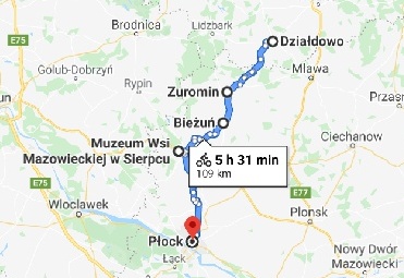 Trasa rowerowa: Rościszewo - Sierpc (Muzeum Wsi Mazowieckiej, kościół i klasztor NMP, ratusz, jatki, kościół farny) - Płock (Wzgórze Tumskie, Małachowianka, dom Władysława Broniewskiego, katedra mariawicka, Muzeum Mazowieckie) (ok. 50 km)