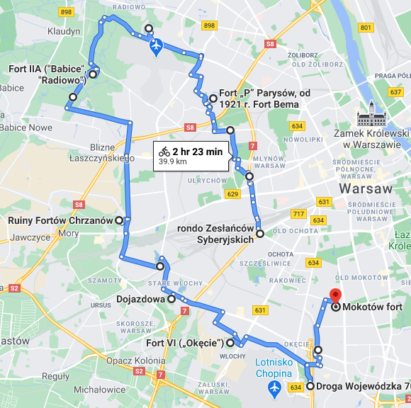 Wycieczka rowerowa na trasie Rondo Zesłańców Syberyjskich - Fort P Bema - Fort II Wawrzyszew - Fort IIA Babice (Radiowo) - Fort III Blizne - Fort IV Chrzanów - Fort V Włochy - Fort VI Okęcie - Fort VII Zbarż - Fort M Mokotów (ok. 40 km, w większości po ścieżkach rowerowych i drogach asfaltowych).