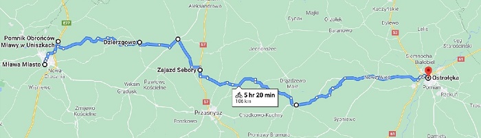 Wyjazd poc. KM linii R90 15423 z W-wy Wola o 08:20, W-wa Gdańska o 08:31, W-wy ZOO o 08:33, W-wa Praga o 08:37, W-wa Toruńska o 08:39. Przyjazd do Mławy Miasto o 10:33. Zbiórka na stacji Mława Miasto po przyjeździe pociągu.
