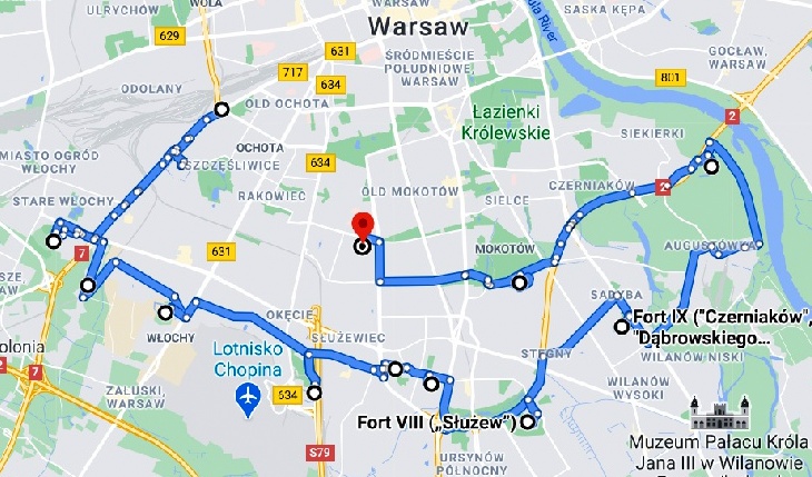 Kontynuacja ubiegłorocznej wycieczki rowerowej po zewnętrznym i wewnętrznym pierścieniu fortów Twierdzy Warszawa. Trasie: Rondo Zesłańców Syberyjskich - Fort Szczęśliwice - Fort V Włochy - Fort VI Okęcie - Fort VII Zbarż - Fort VIIa Służewiec - Fort VIII Służew - Fort IX Czerniaków - Fort X Augustówka - Fort Piłsudskiego - miejsce Fortu Odyńca - Fort M Mokotów (ok. 43 km, w większości po ścieżkach rowerowych i drogach asfaltowych).