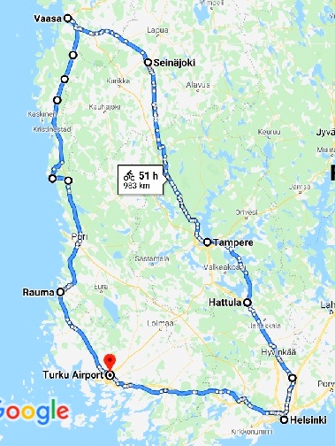 20.07 (śr) wylot z lotniska Modlin samolotem FR 9320 o 12:25; przylot do Helsinki Vantaa o 15:10; trasa rowerowa Vantaa - Hyrylä - Lotta Museum - Ainola (dom Sibeliusa) - Järvenpää -Jokela (36 km, 142m, 120m)