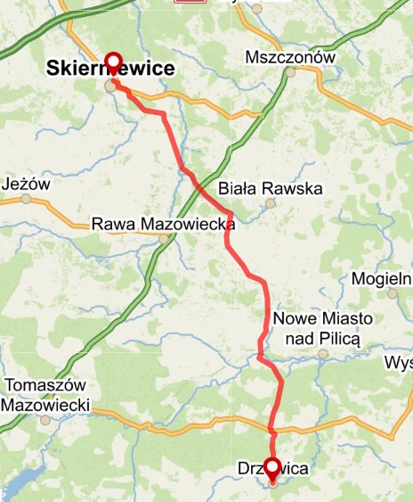 Wyjazd poc. KM R8 12614/12615 z W-wy Gdańskiej o 6:34, W-wy Zach. peron 8 o 06:46, W-wy Służewiec o 06:58. Przyjazd do Radomia o 08:26. Przesiadka do pociągu ŁKA L 21206, odjazd z Radomia o 09:10. Przyjazd do Drzewicy o 09:57. Zbiórka na stacji Drzewica po przyjeździe pociągu.