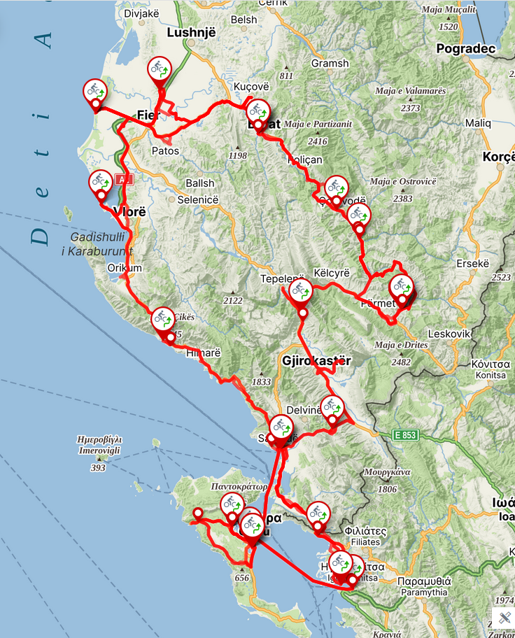 Dwutygodniowy obóz rowerowy na trasie Igumenista - granica grecko-albańska - wykopaliska Butrint - Ksami- Saranda (Riwiera albańska) - źródło Blue Eye - wykopaliska Hadrianopolis - Gjirokastёr („Srebrne miasto", zamek i miasto wpisane na listę zabytków UNESCO) - wykopaliska Antigonea - Tepelene - kanion Lengarices i zródła termalne Baniat - kanion rzeki Osumi - Berat ("Miasto tysiąca okien", wpisane na listę zabytków UNESCO) - klasztor Ardenice - wykopaliska Apolonia - Vlora - Orikum (wykopaliska) - przełęcz Liogara Pass (1027 m) - Dhermi - Himare - Porto Palermo i zamek Alego Paszy - Saranda - przeprawa promem na Korfu (wylot do Warszawy). Łączny dystans 850 km.