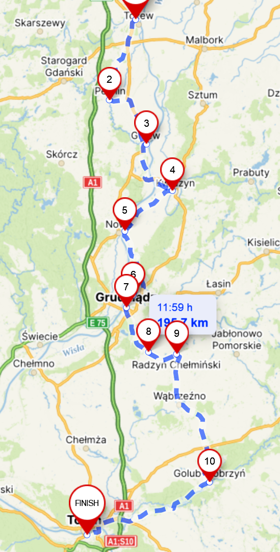 Czterodniowa wycieczka rowerowa po Kociewiu, Powiślu i Ziemi Chełmińskiej. Na trasie dawne zamki krzyżackie lub ich ruiny, liczne zabytki sakralne (w stylu tzw. gotyku nadwiślańskiego), atrakcje przyrodnicze dolin dolnej Wisły i Drwęcy oraz Pojezierza Chełmińskiego, a także zabytkowe zespoły miejskie Grudziądza i Torunia.