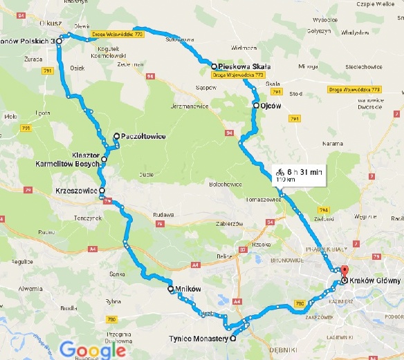 Dwudniowa wycieczka rowerowa w okolicach Krakowa (bez zwiedzania Starego Miasta w Krakowie). Na trasie m.in. liczne zabytki architektury (opactwo benedyktynów w Tyńcu, zespól dworski w Mnikowie, zespól pałacowy w Krzeszowicach, kościół i klasztor karmelitów bosych w Czernej, drewniany kościół w Paczółtowicach, bazylika św. Andrzeja, fragmenty obwarowań miejskich i zabytkowe kamienice w Olkuszu, zamek w Pieskowej Skale, ruiny zamku w Ojcowie, kościół św. Idziego w Giebułtowie) oraz obiekty przyrodnicze (rez. Wąwóz Mnikowski [dolina Sanki, dolina Eliaszówki, Ojcowski Park Narodowy).