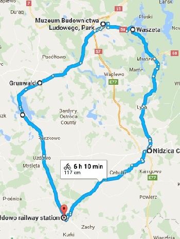 Trasa rowerowa: Tolejny - Olsztynek - Mierki - Maróz - Łyna - Nidzica - Kozłowo - Działdowo 66 km (suma podjazdów i zjazdów ok. 230m)