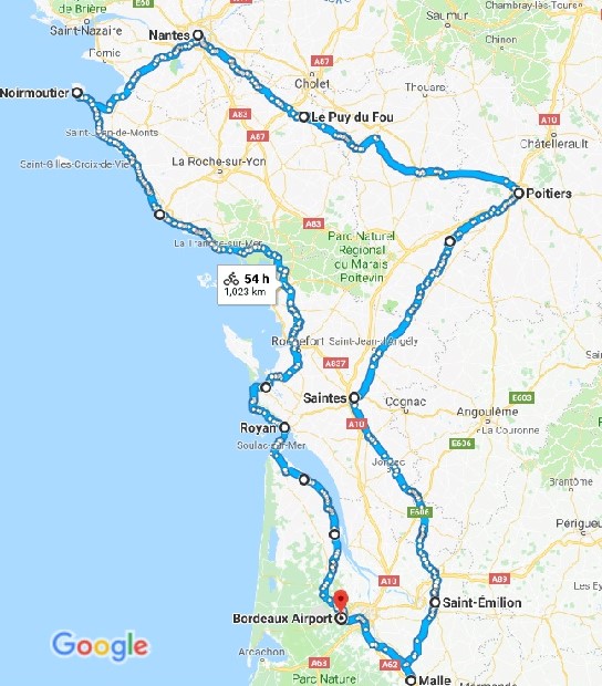 Piąty z kolei letni obóz rowerowy do Francji. Dla przypomnienia, poprzednie były organizowane w 1995 - Lotaryngia i Alzacja, 2005 - Pireneje i Langwedocja, 2010 - Alpy Francuskie, Prowansja i dolina Rodanu i 2016 - Normandia. Tym razem zwiedzimy znaczną część atlantyckiego wybrzeża Francji (Zatoka Biskajska), południową Bretanię (Nantes), Wandeę (m.in. Poitiers) oraz północną Akwitanię (Bordeaux i okolice)